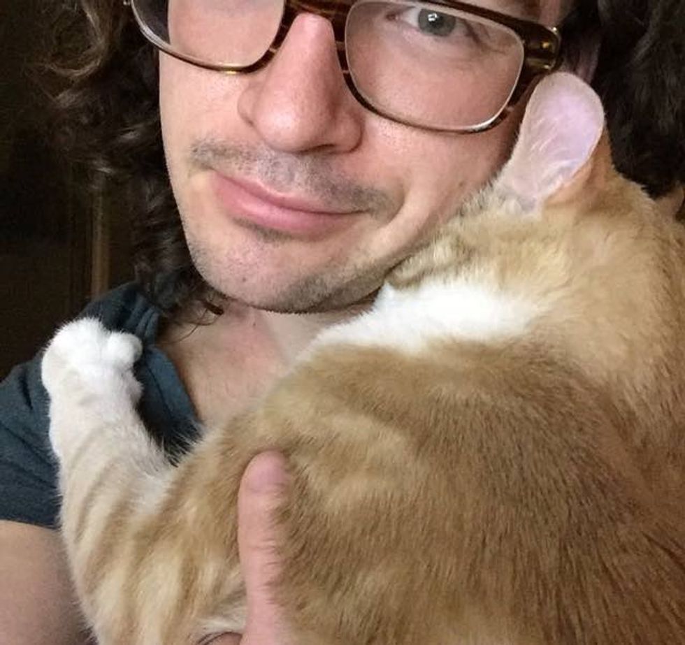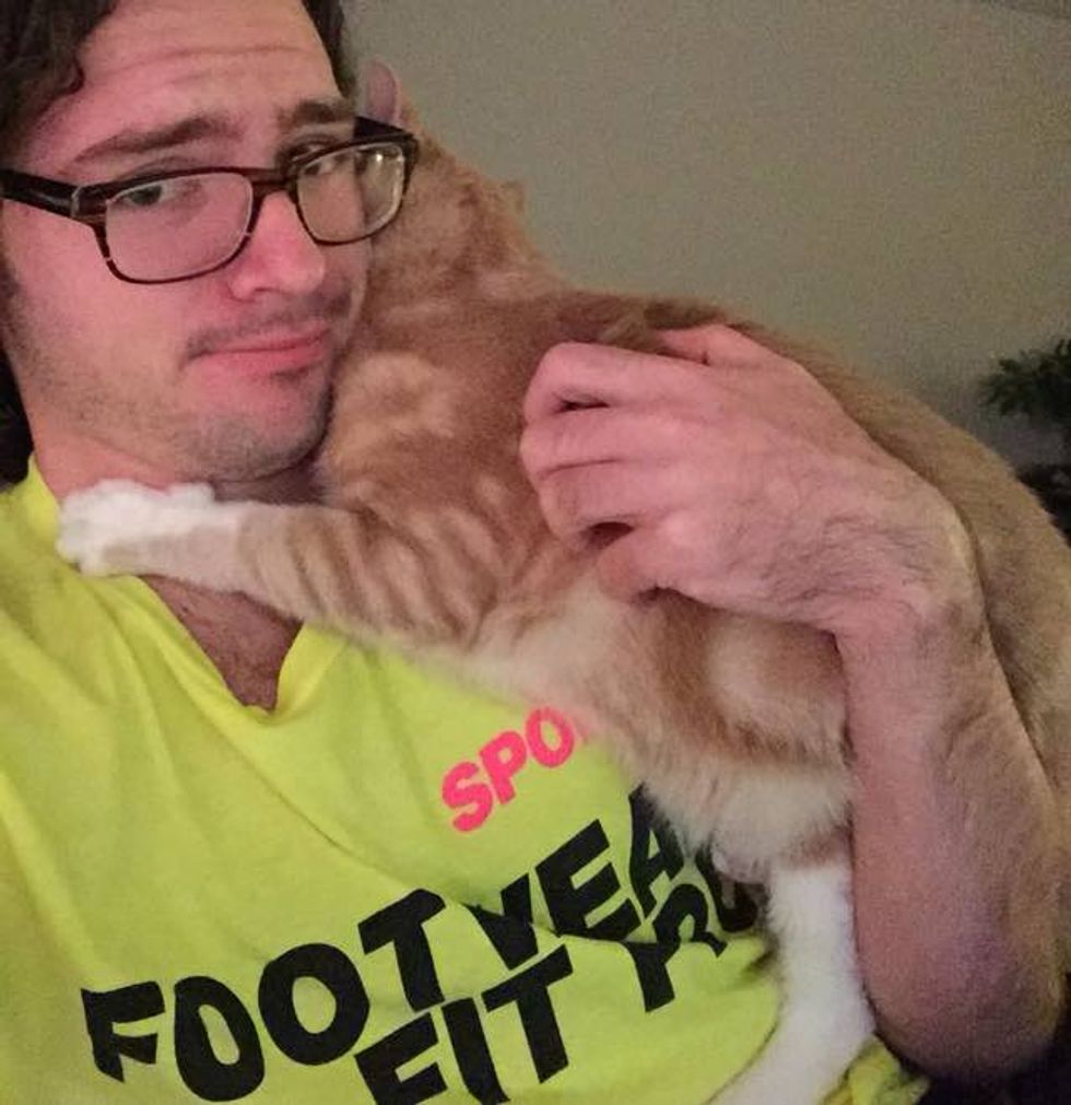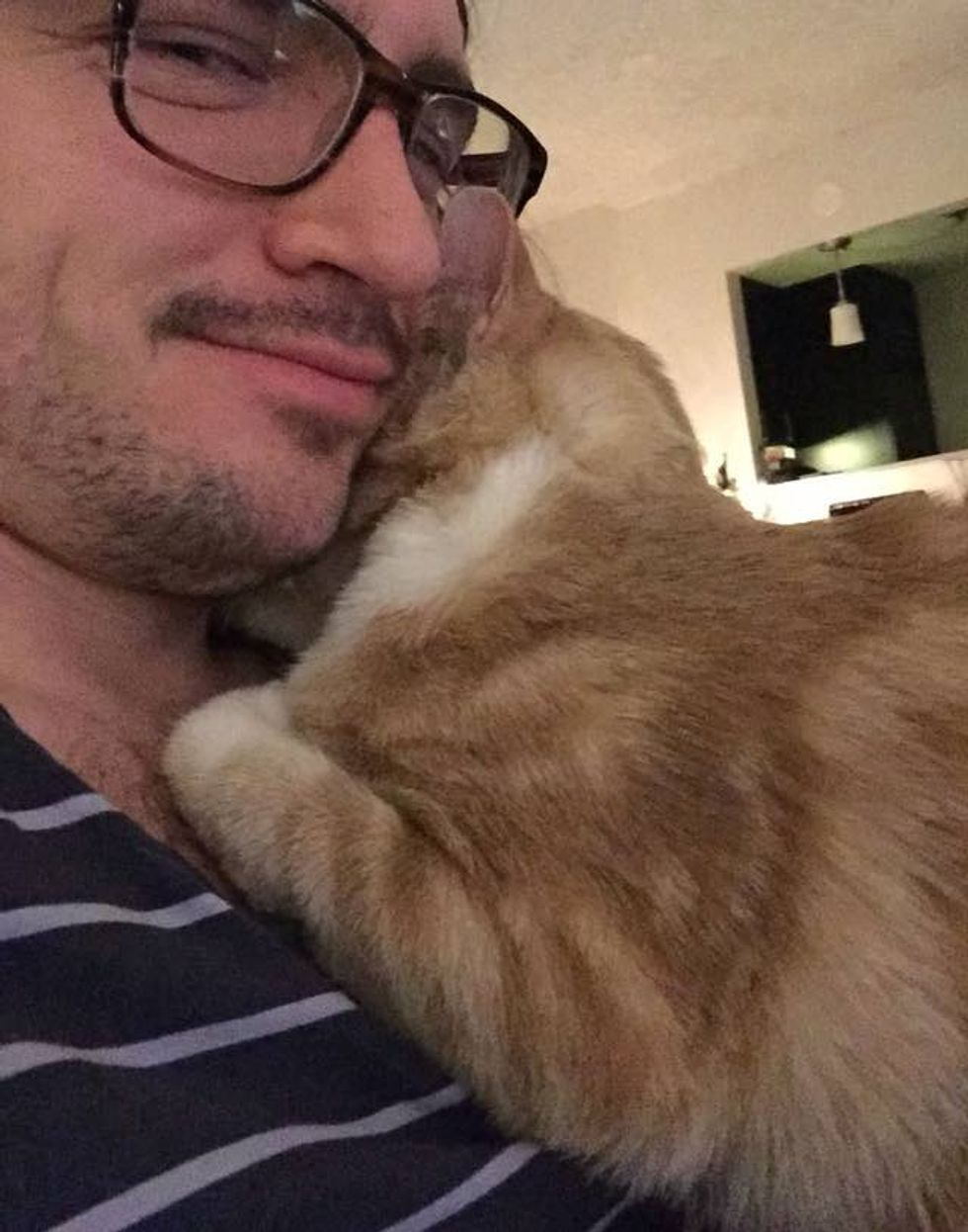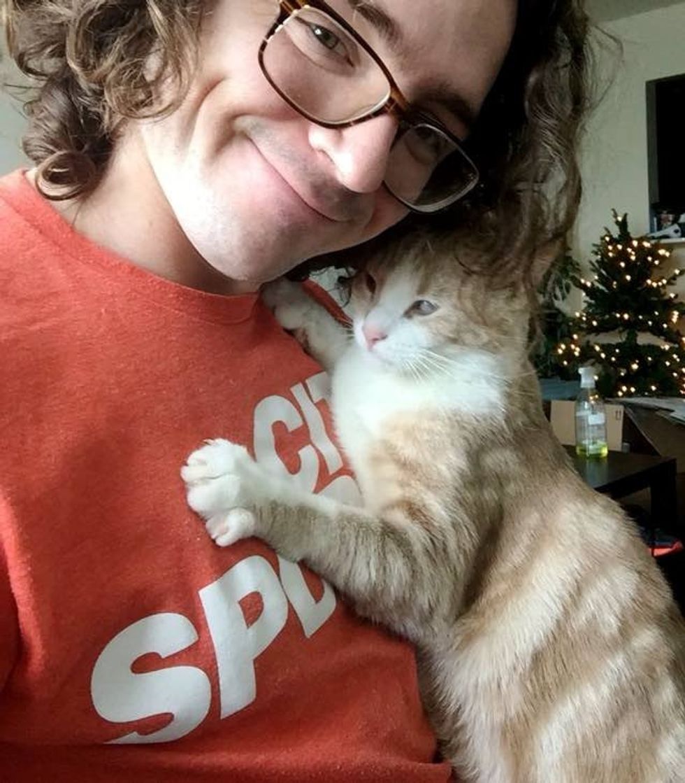Butters has been attached to his human dad since the day they met. "He still kneads and hugs and throws himself at me. Wouldn't trade it for anything."