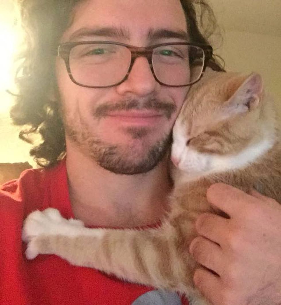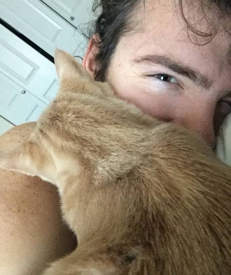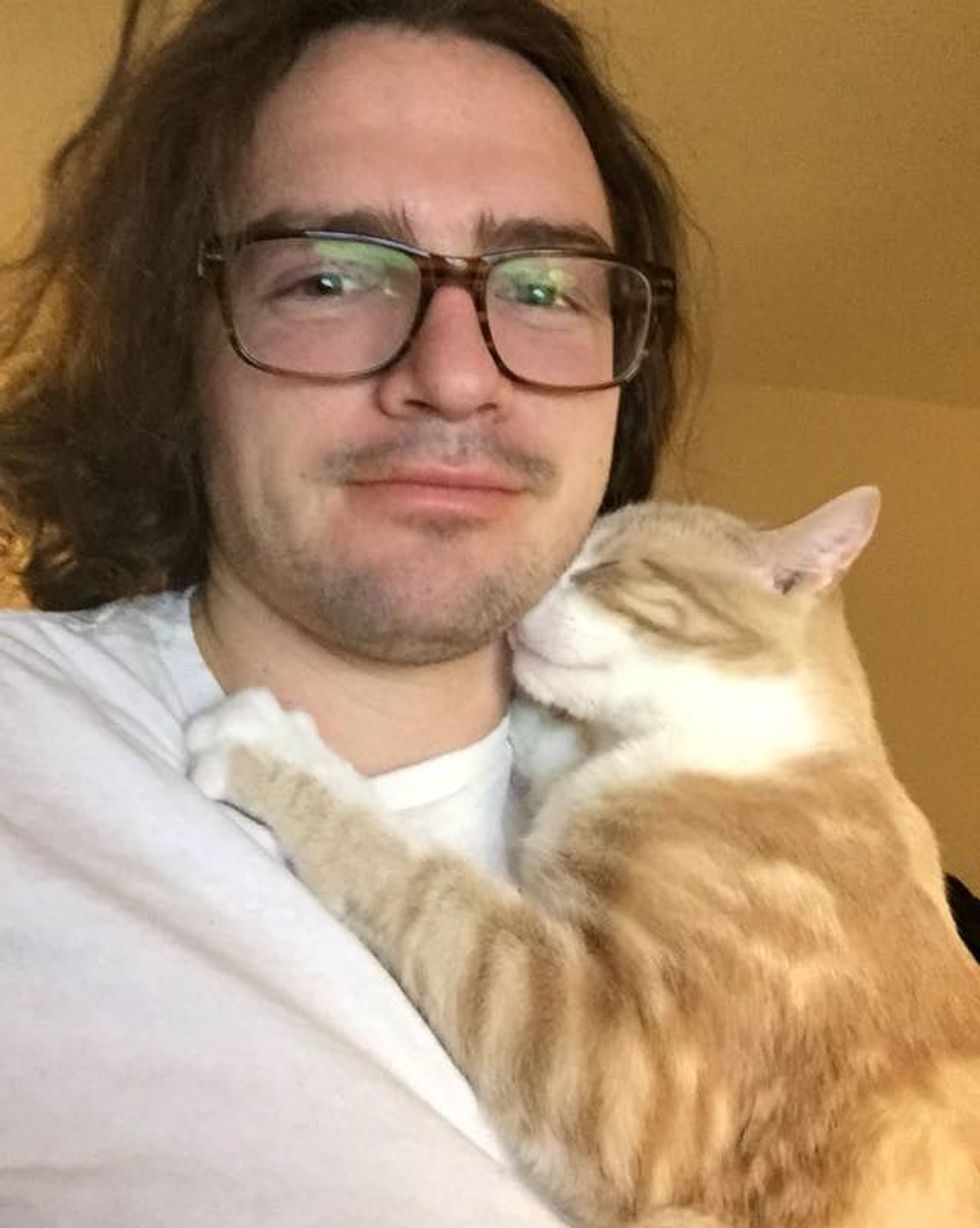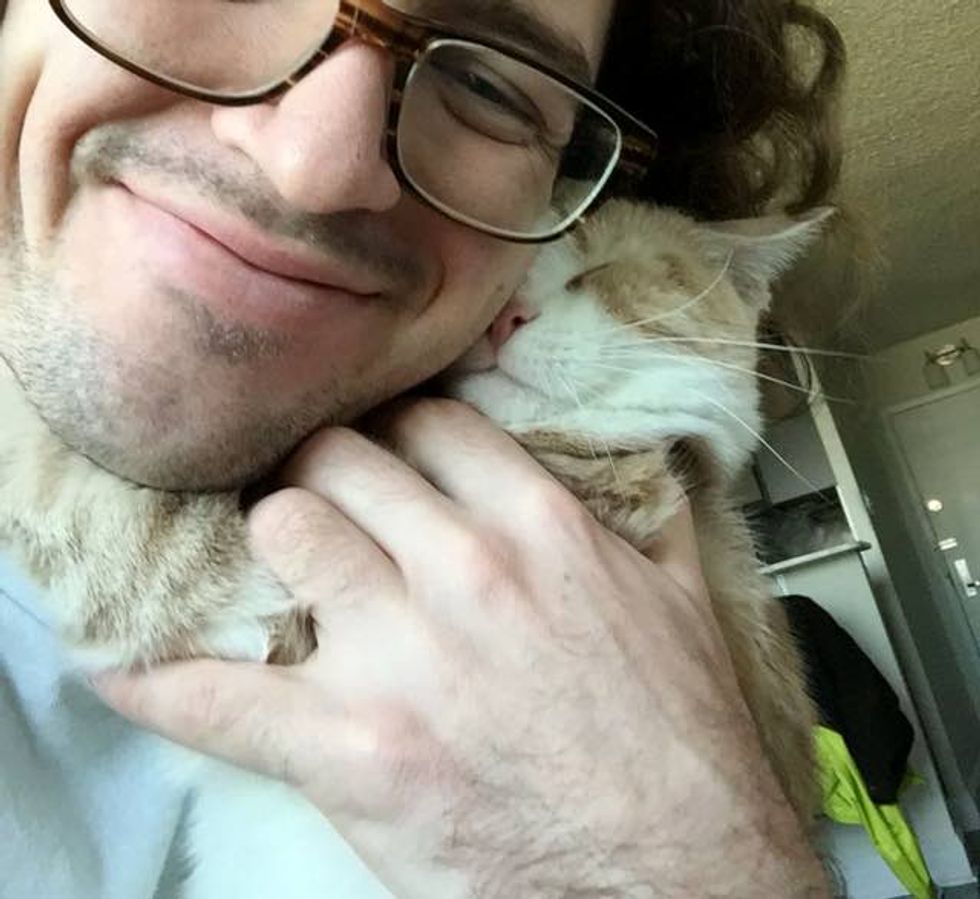 Butters has been attached to his human dad since the day they met. "He still kneads and hugs and throws himself at me. Wouldn't trade it for anything."