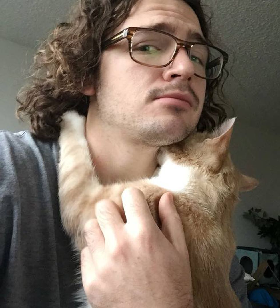 Philadelphia Animal Welfare Society (PAWS), they were 3 months old. He started with making tiny kitty biscuits and nursing from my neck or cheek. We think he got taken away from his mom a bit too early. So now I'm his mom," Luke told Love Meow.
