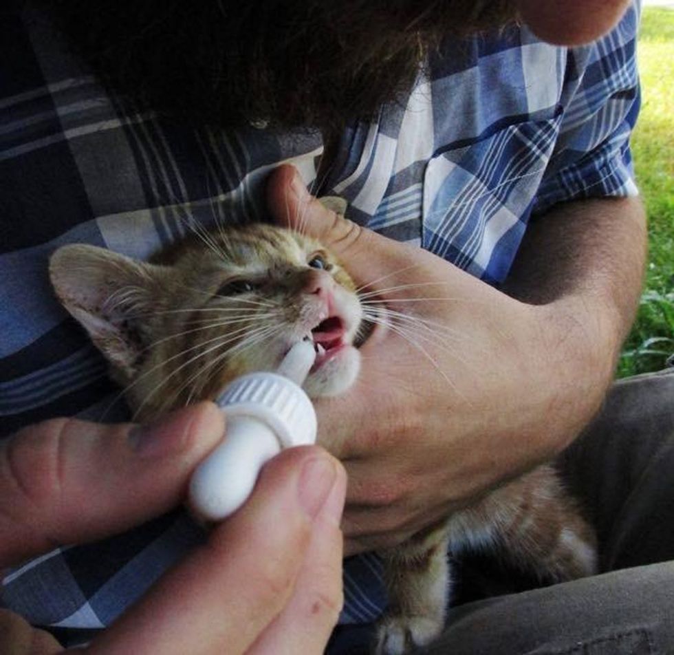 The young man took the kitten home and started caring for him. With help from a dropper, he was able to get water and food into his mouth and help the kitten get the strength he needed.