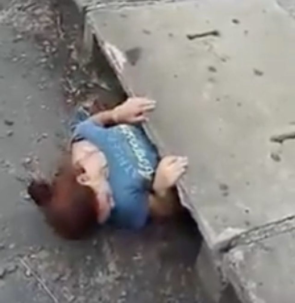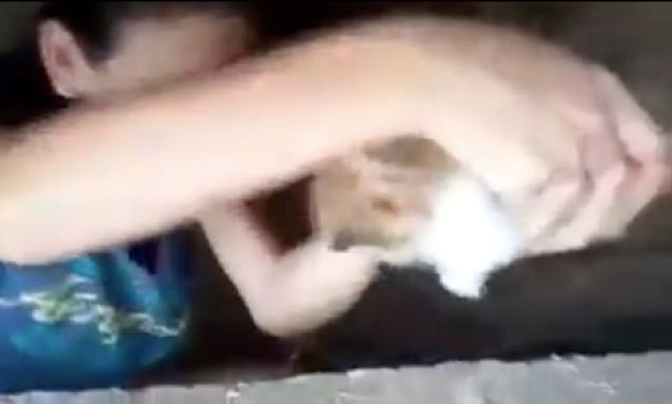 A young woman squeezed herself into a sewer drain through a narrow opening to save a tiny crying kitten.