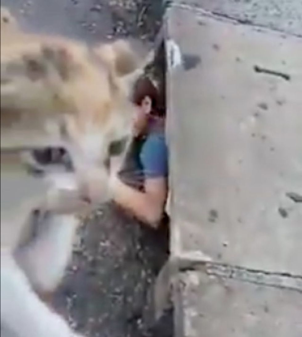 The cat was safe outside the drain, but the young woman needed some help to get out.